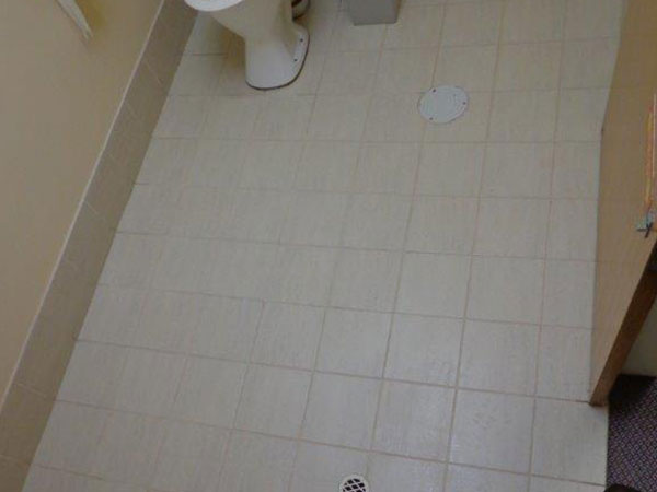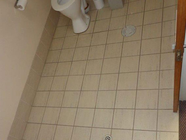 | Public restroom tiles & grout with dark, built up grime |